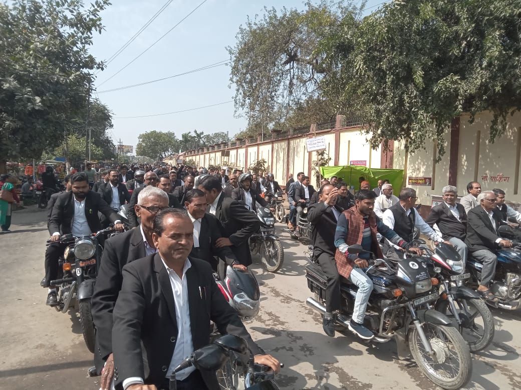 ग्रामीण न्यायालय गठन के विरोध में अधिवक्ताओं का आंदोलन बुधवार को लगातार 21 वें दिन भी जारी रहा। पूर्व निर्धारित कार्यक्रम के अनुसार अधिवक्ताओं ने बुधवार को शहर में मोटरसाइकिल जुलूस निकाला। यह जुलूस दीवानी न्यायालय से निकलकर कलेक्ट्रेट होते हुए हर की चुंगी तक पहुंचा तत्पश्चात कोट मोहल्ला डीएवी कॉलेज होते हुए सिधारी स्थित कमिश्नरी पहुंचा।जहां अधिवक्ताओं ने सेंट्रल बार एसोसिएशन के अधिवक्ताओं ने जुलूस का स्वागत किया। वहां से वापस दीवानी कचहरी वापस किया। पूर्व दीवानी न्यायालय अभिभाषक संघ की साधारण सभा की बैठक हुई। बैठक की अध्यक्षता संघ के अध्यक्ष अशोक कुमार पांडेय तथा संचालन मंत्री आनंद श्रीवास्तव एडवोकेट ने किया। बैठक में ग्रामीण न्यायालय के गठन के विरोध में चल रहे आंदोलन को जारी रखने का निर्णय लिया गया। तत्पश्चात अपने हाथों में ग्रामीण न्यायालय वापस लो की तख्तियां लिए हुए दीवानी न्यायालय परिसर से बाहर निकले। इस जुलूस में पूर्व अध्यक्ष राजेंद्र प्रसाद सिंह,ओम प्रकाश मिश्रा,प्रभाकर सिंह, सूबेदार यादव, पूर्व मंत्री अनिल सिंह वीरेंद्र प्रताप सिंह, राजेश कुमार सिंह पराशर,अरुणेंद्र कुमार सिंह,महेंद्र सिंह सैकड़ों अधिवक्ता शामिल हुए।