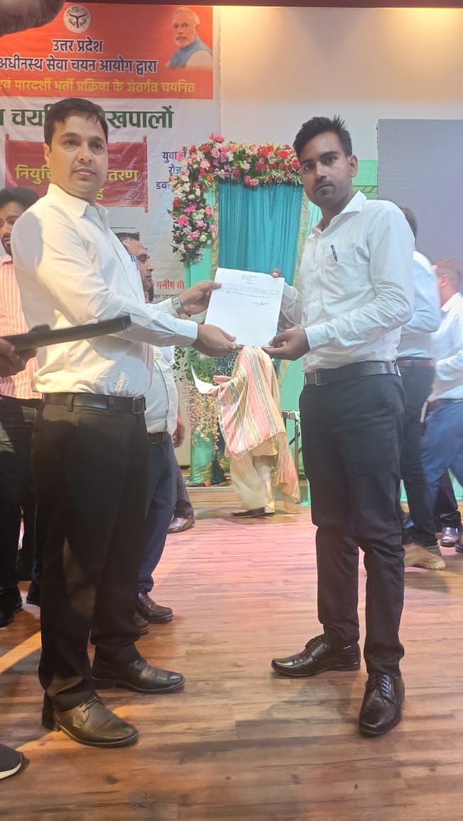 मुख्यमंत्री योगी आदित्यनाथ द्वारा बुधवार को लोकभवन लखनऊ में अधीनस्थ सेवा चयन आयोग द्वारा निष्पक्ष एवं पारदर्शी भर्ती प्रक्रिया के अन्तर्गत प्रदेश में नव चयनित 7720 लेखपालों को नियुक्ति पत्र वितरण कार्यक्रम का शुभारम्भ किया गया। उक्त कार्यक्रम का सजीव प्रसारण मण्डलायुक्त मनीष चैहान एवं जिलाधिकारी विशाल भारद्वाज की उपस्थिति में हरिऔध कला केन्द्र आजमगढ़ में किया गया।