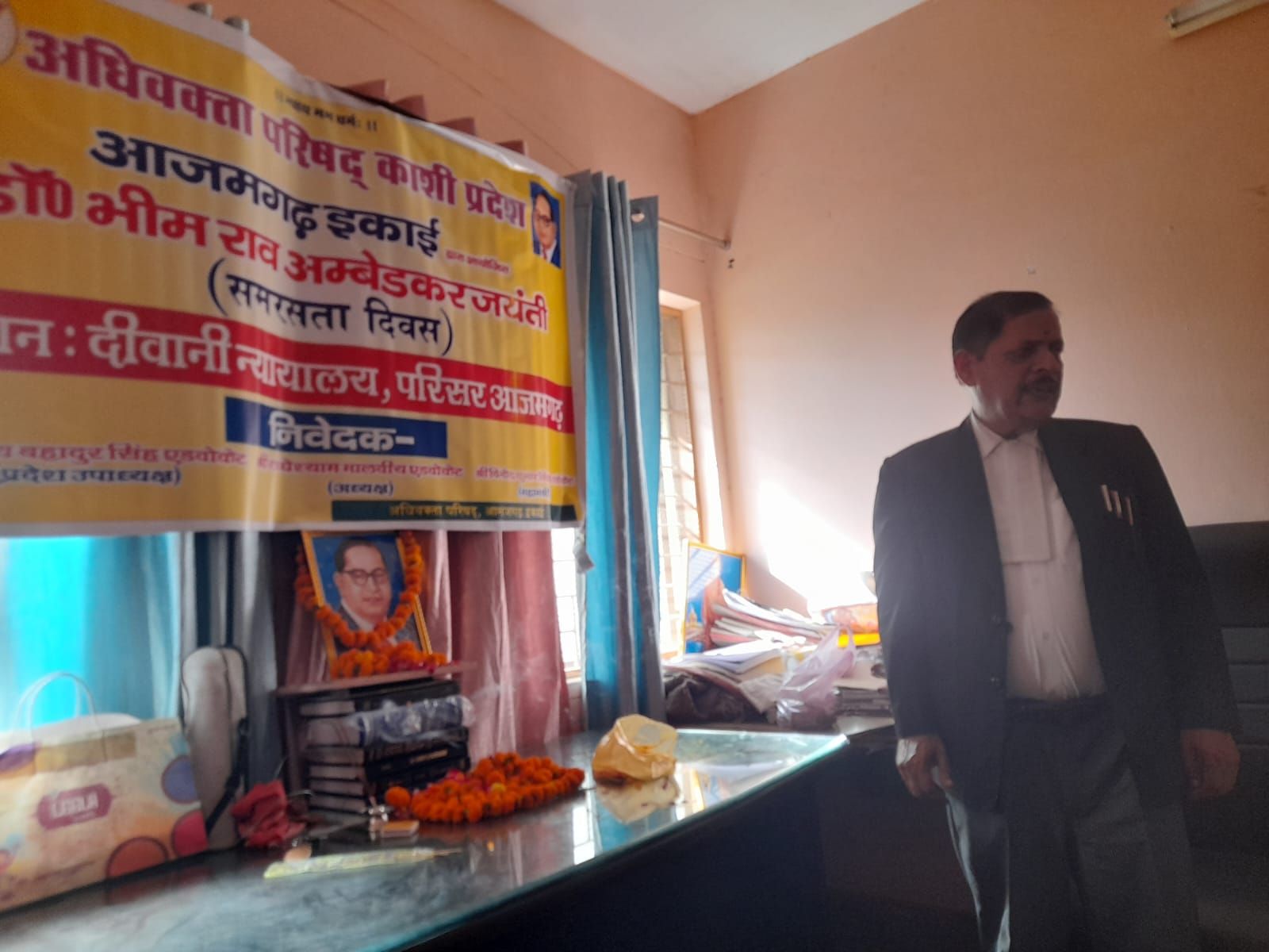 अधिवक्ता परिषद आजमगढ़ इकाई ने दीवानी न्यायालय में स्थित अधिवक्ता भवन में गुरुवार को डॉक्टर भीमराव अंबेडकर की जयंती को समरसता दिवस के रूप में मनाया। इस अवसर पर अधिवक्ता परिषद के प्रांतीय उपाध्यक्ष विजय बहादुर सिंह ने कहा कि बाबा साहब ने हमें दुनिया का सबसे बेहतरीन संविधान दिया। संविधान के आदर्शो का अनुकरण करना ही बाबा साहब को सच्ची श्रद्धांजलि होगी। इससे पूर्व सभी अधिवक्ताओं ने बाबा साहब डॉक्टर भीमराव अंबेडकर के चित्र पर माल्यार्पण कर उन्हें श्रद्धांजलि दी। गोष्टी को अधिवक्ता परिषद के जिलाध्यक्ष राधेश्याम मालवीय ,महामंत्री विनोद कुमार सिंह ने भी संबोधित किया। बक्ताओं ने डॉ बी आर अंबेडकर को पिछले शदी का महानायक बताया और कहा कि उनके विचार सदैव हम सबको प्रेरित करते रहेंगे। इसके अलावा इस गोष्ठी में वीरेंद्र सिंह, प्रेम प्रकाश सिंह ,पवन कुमार सिंह, शिवम पांडे ,अवनीश कुमार सिंह ,रतिभान सिंह, दिनेश मौर्य, केसरी सिंह, उदयभान सिंह, राजेश सिंह पाराशर ,विनय कुमार मिश्रा, सुधांशु राय ,रविंद्र नाथ पांडे ,अश्वनी कुमार राय ,राजेश सिंह तोमर, मोनिका सिंह, सदानंद यादव ,सर्वेश सिंह, प्रभाकर कुमार श्रीवास्तव , सत्यनारायण लाल समेत बहुत से अधिवक्ता शामिल हुए।