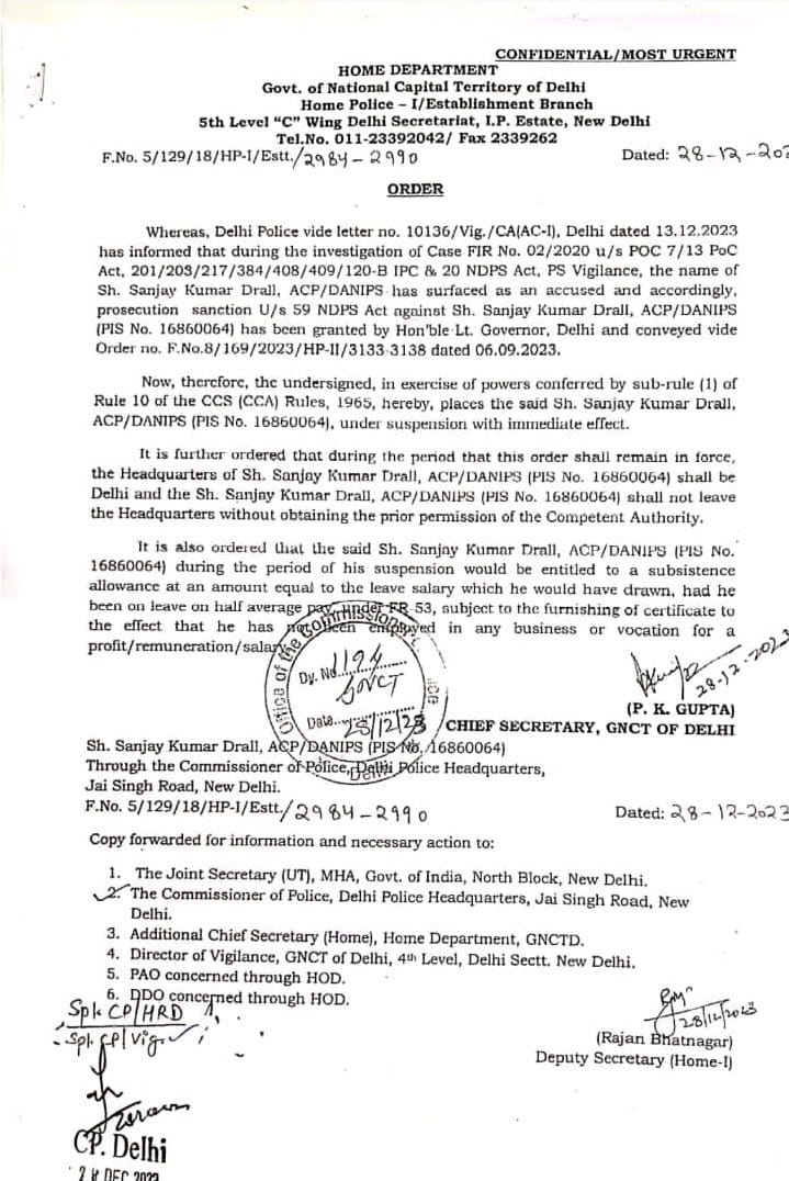 संजय कुमार द्राल दिल्ली पुलिस के सहायक पुलिस आयुक्त के पद पर उनकी तैनाती थी। उन्हें 31 दिसंबर 2023 को रिटायर होना था। उससे पहले ही उनकी खिलाफ चल रही जांच को विजलेंस विभाग की टीम ने पूरी कर यह रिपोर्ट सौंपा। जिसमें एसीपी संजय दोषी करार दिए गये हैं। ऐसे में उन्हें सेवानिवृत्ति के ठीक एक दिन पहले ही उन्हें निलंबित कर दिया गया। अंदेशा है संजय के जरिए पुलिस ड्रग्स रैकेट से जुड़े अन्य सदस्यों तक पहुंच सकती है। इन सभी तख्यों की गहनता से जांच पड़ताल की जा रही है। जल्द ही कयी चौकाने वाले तथ्यों का खुलासा हो सकता है।
