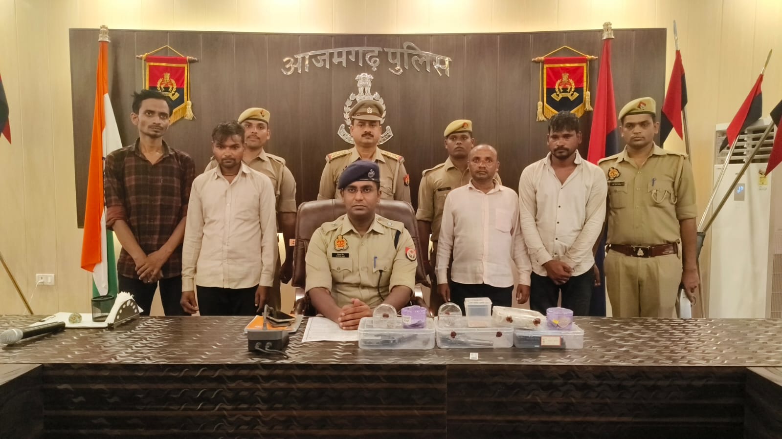 सूरज सोनी पुत्र शेषनाथ सोनी निवासी भेड़िया थाना फूलपुर का नाम शामिल है। जबकि दीदारगंज थाने के सिंगारपुर गांव निवासी रोशन उर्फ उजागिर पुत्र जंगबहादुर फरार हो गया। उसकी तलाश की जा रही है। एसपी ग्रामीण के मुताबिक सरायमीर थाना क्षेत्र में महिलाओं को कागज का बंडल थमाकर उनके आभूषण लेने की गयी घटनाएं हो चुकी थी। एसपी हेमराज मीना ने घटना के खुलासे के लिए थानाध्यक्ष सरायमीर को निर्देश दिया था। जिसके बाद प्रभारी निरीक्षक सरायमीर यादवेंद्र पांडेय अपनी टीम के साथ लगे हुए थे। सोमवार को मुखबिर के जरिए मिली सूचना के आधार पर चार ठगों को गिरफ्तार कर लिया गया। जबकि एक फरार हो गया। गिरफ्तार आरोपियों के पास से 1.2 लाख रुपये के आभूषण, दो बाइक, एक तमंचा और कारतूस बरामद हुए।