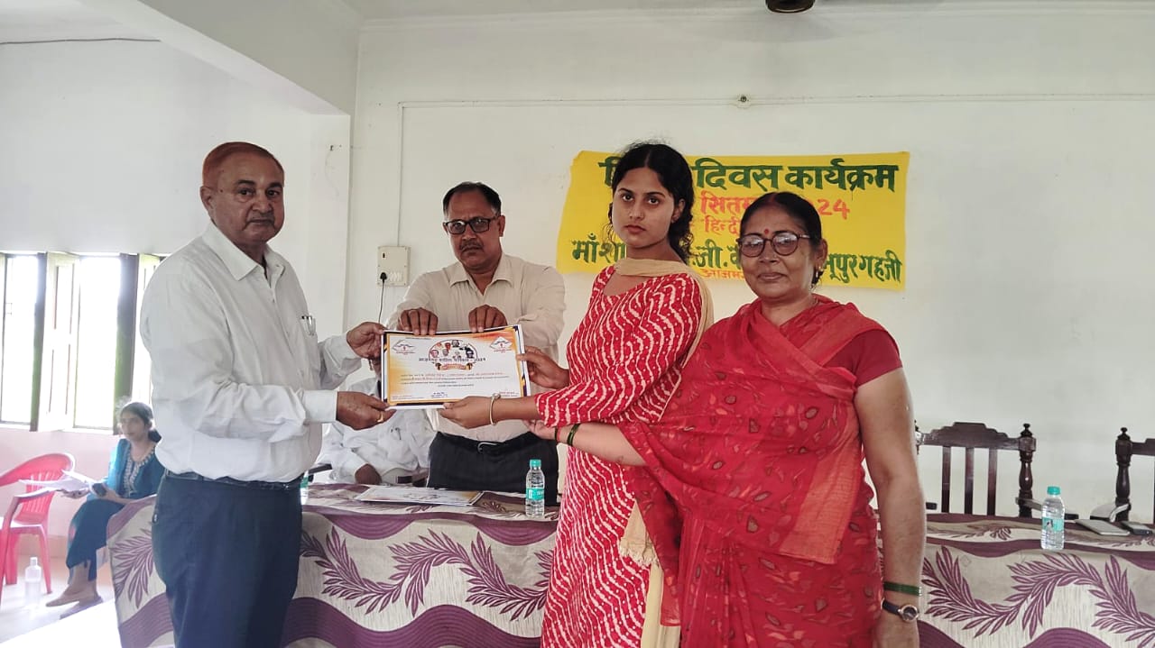 शनिवार को हिंदी दिवस के अवसर पर मां शारदा पीजी कॉलेज शंभूपुर गहजी अहरौला में हिंदी विभाग द्वारा हिंदी विषय पर विशेष कार्यक्रम का आयोजन किया गया। कार्यक्रम की अध्यक्षता प्राचार्य डॉ दिवाकर सिंह ने किया। कार्यक्रम का शुभारंभ मां सरस्वती के चित्र पर धूप दीप और माल्यार्पण कर किया गया। छात्रों द्वारा सरस्वती वंदना राष्ट्रगीत गाकर “हिन्दी है हम वतन है हिन्दोस्ता हमारा” गाकर हिंदी की व्यापकता और उपयोगिता पर प्रकाश डाला कहां की हमारी मातृभाषा हिंदी है बड़े पैमाने पर हिंदी भाषा का प्रयोग देश में किया जाता है, हमें अपने हिंदी भाषा पर गर्व है वहीं अन्य वक्ताओं ने भी हिंदी भाषा प्रकाश डालते हुए कहा कि हिंदी कोई साधारण भाषा नहीं है। हिंदी हमारी मातृभाषा है। हम इसका सम्मान करें। वही 2023 में आयोजित जनपद स्तरीय साहित्य महोत्सव में स्कूल के छात्र छात्रों ने प्रतिभा किया था। उसमें विजेता रहे छात्र-छात्राओं को स्कूल के हिन्दी विभाग द्वारा हिन्दी दिवस पर छात्र-छात्राओं को प्राचार्य डॉ दिवाकर सिंह के द्वारा प्रशस्ति पत्र देकर सम्मानित किया गया। इस मौके पर डॉ दिवाकर सिंह, डॉ नागेंद्र नाथ सिंह, डॉ प्रमोद मिश्रा, केशर सिंह, मनोज चौबे,नीलम सिंह, आदि लोग मौजूद रहे।