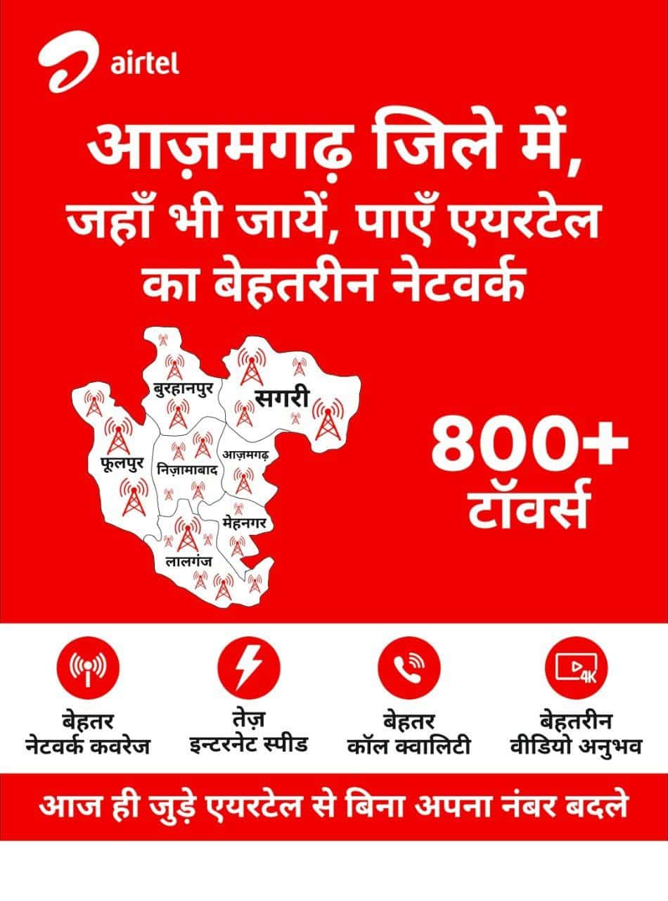 आज के दौर में लोगों की जिंदगी की सबसे बड़ी जरूरत मोबाइल बन गयी है। इसके बिना किसी का कोई काम नहीं होना है। ऐसे में भारतीय एयरटेल अपने धारकों का और उनके नेटवर्क का विशेष ख्याल रखती है। यही कारण है कि भारतीय एयरटेल ने आजमगढ़ में 800 से ज्यादा टावर लगा कर स्पर्धा कंपनी से 6% ज्यादा टावर लगाने का मुहिम प्राप्त कर लिया है।