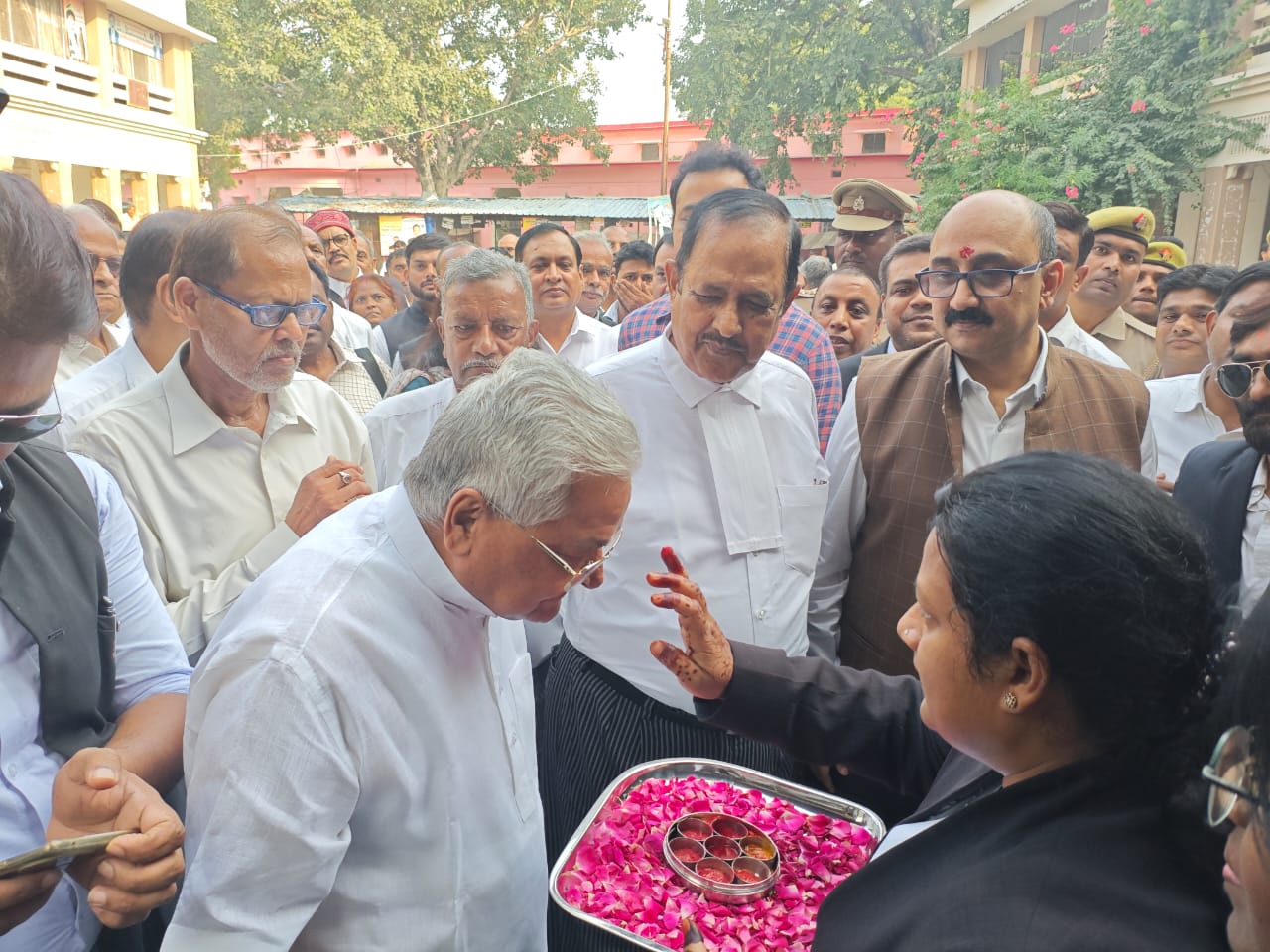 इससे पूर्व दीवानी न्यायालय परिसर में पहुंचने पर वीपी श्रीवास्तव का बैंड बाजा के साथ तिलक लगा कर स्वागत किया गया।