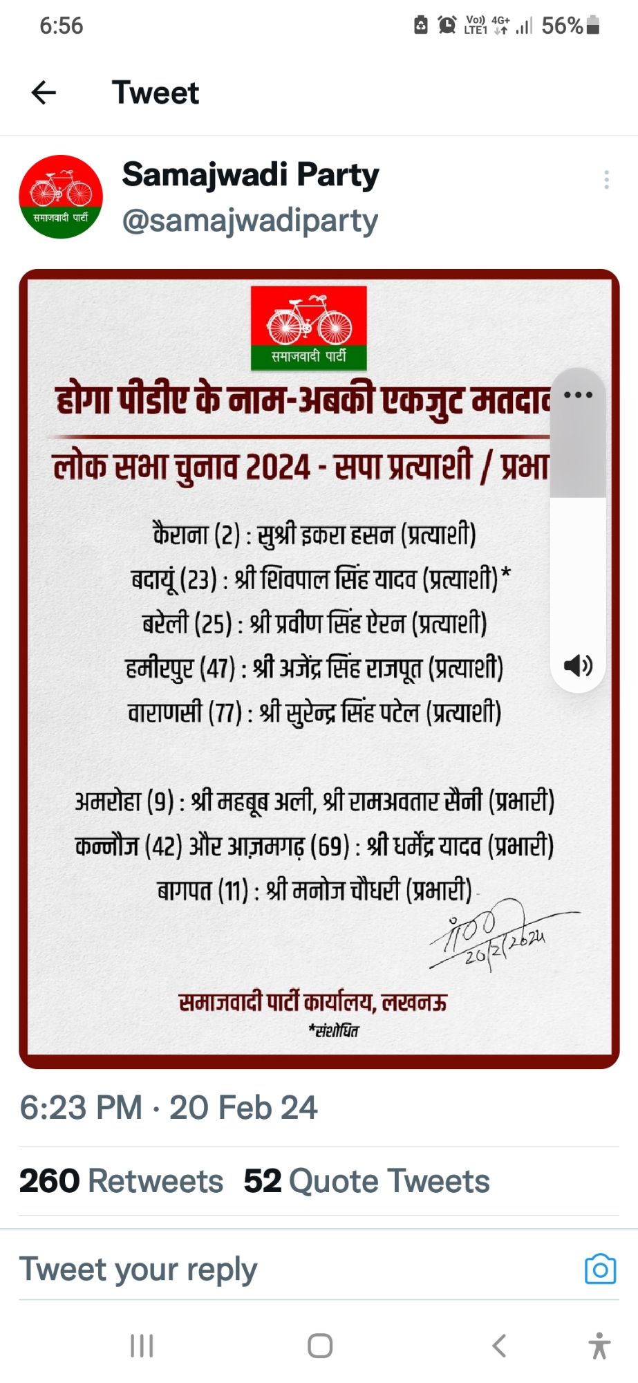 मंगलवार को सपा के ट्विटर और अन्य सोशल मिडिया प्लेटफार्मों के माध्यम से जारी किए गये पत्र के मुताबिक कैराना (2) से इकरा हसन, बदायू (23) शिवपाल सिंह यादव, बरेली (25) से प्रवीण सिंह ऐरन, महीरपुर (47) से अजेंद्र सिंह राजपूत, वाराणसी (77) से सुरेंद्र सिंह पटेल, अमरोहा (9) से महबूब अली को बनाया गया है। जबकि आजमगढ़ और कन्नौज के लिए धर्मेंद्र सिंह, अमरोहा के लिए राम अवतार सैनी और बागपत के लिए मनोज चौधरी को प्रभारी बनाया गया है।