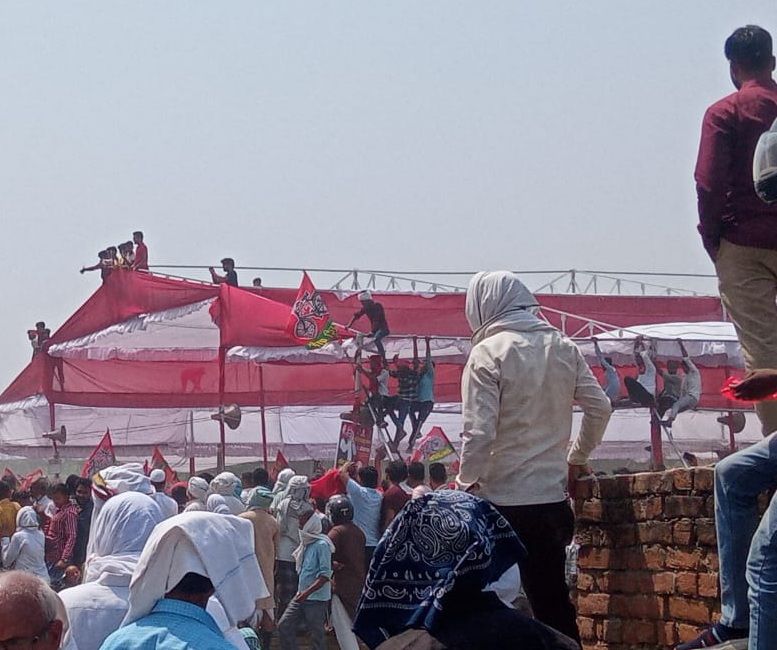 लोकसभा चुनाव 2024 के लिए 25 मई को जिले में मतदान होना है। मंगलवार को जिले में मुख्यमंत्री योगी आदित्यनाथ और पूर्व मुख्यमंत्री अखिलेश यादव की जनसभा आयोजित थी। योगी का सगड़ी विस क्षेत्र में कार्यक्रम था। जबकि लालगंज लोकसभा क्षेत्र के खरेवां मोड़ सरायमीर में सपा प्रमुख की जनसभा थी। अखिलेश को सुनने के लिए बड़ी संख्या में भीड़ थी। दोपहर करीब एक बजे के आसपास अखिलेश मंच पर पहुंचे। उन्हे देखते ही उनकी पार्टि के कार्यकर्ता इतना उत्साहित हो गये कि पंडाल की पाइपों पर चढ़कर हल्ला करने लगे। भीड़ बैरिकेडिंग तोड़ कर मंच के करीब पहुंच गये। स्थिति अनियंत्रित देख पुलिस लाठी भांजकर मामला शांत कराने के प्रयास में जुट गयी। लेकिन माहौल खराब होने लगा। यह देखकर अखिलेश यादव स्वयं मंच संभालते हुए शांत रहने की अपील करने लगे। अखिलेश के बार बार निवेदन करने के बाद माहौल शांत हुआ। इसके बाद उनका संबोधन शुरू हुआ। करीब आधे घंटे के संबोधन में अखिलेश के निशाने पर भाजपा और सरकार रही। बता दें कि दो दिन पूर्व प्रयगराज के फूलपुर में अखिलेश यादव और कांग्रेस के पूर्व अध्यक्ष राहुल गांधी की जनसभा में भी कुछ इसी तरह का माहौल रहा।